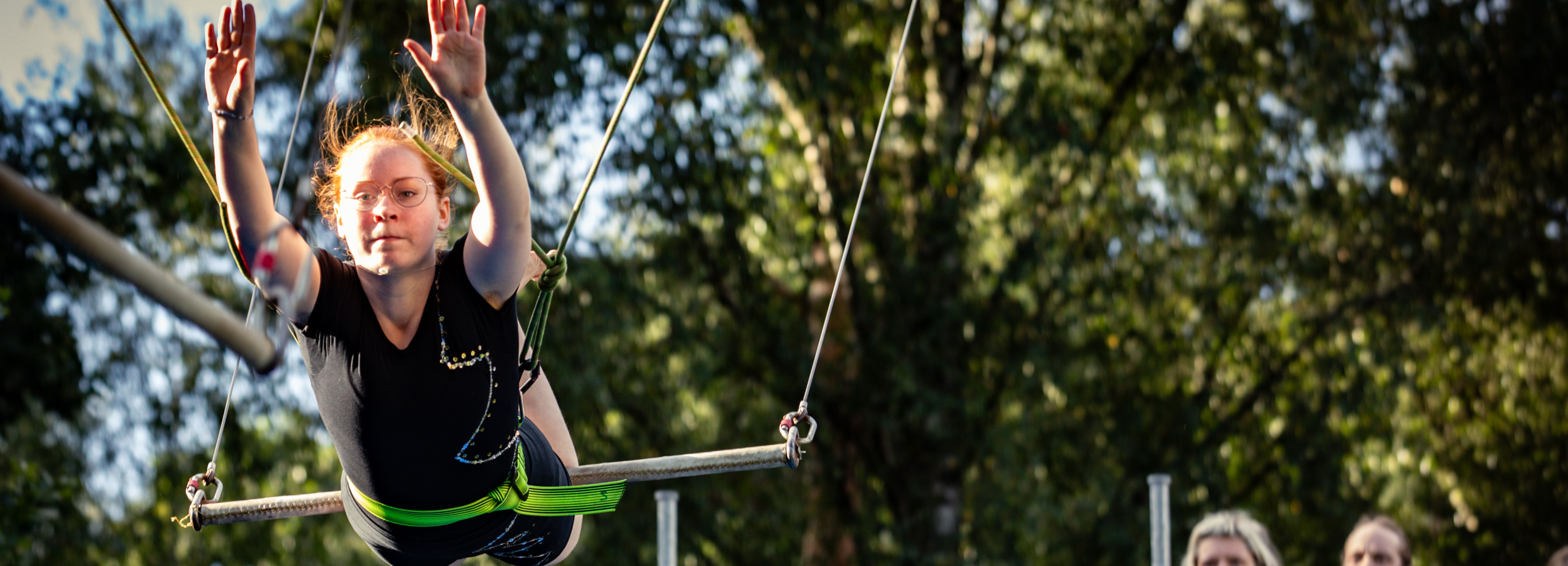 Der Traum vom Fliegen kann wahr werden, bei uns kann jeder von 8 bis 88 fliegen lernen. An unserer Flugtrapez- Anlage schwingst du locker von der Plattform über den Airtrack in die Weite hinaus und machst eine hübsche Figur, bevor du an der Stange vom zweiten Trapez ankommst. Dabei ist es egal, ob Du schon Zirkus- oder gar Trapezerfahrung hast, denn wir zeigen dir wie´s geht. Dank der Sicherung mit Longe und Gurt sowie einem extra angefertigten Airtrack kannst du das Schwingen ganz unbeschwert genießen.